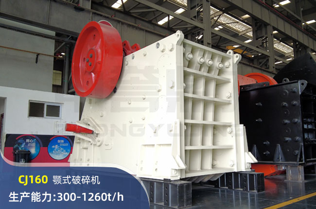 CJ160顎式破碎機(jī)進(jìn)料口尺寸1600×1200mm,進(jìn)料粒度960mm,出料大小150-300mm,電機(jī)功率250kw,時產(chǎn)可達(dá)1260噸。