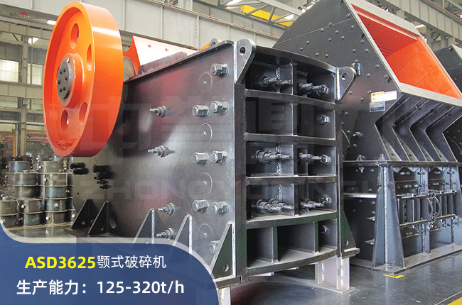 ASD3625顎式破碎機進料粒度425mm,出料粒度50mm,產量在125-320噸左右,屬于中小型顎式破碎機。