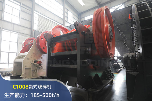 C1008顎式破碎機(jī)時產(chǎn)量在185-500噸左右,電機(jī)配備的是110kw的,進(jìn)料粒度800mm,出料粒度65mm,屬于中小型顎式破碎機(jī)。