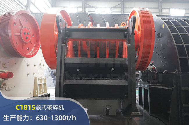 C1815顎式破碎機進料口尺寸1800×1500mm,進料粒度≤1500mm,出料大小≤125mm,電機功率355kw,時產可達1300噸左右。
