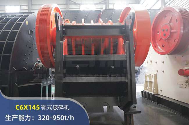 C6X145顎式破碎機進料口尺寸1100×1450mm,進料粒度≤1100mm,出料大小≤125mm,電機功率200kw,時產在320-950噸左右。