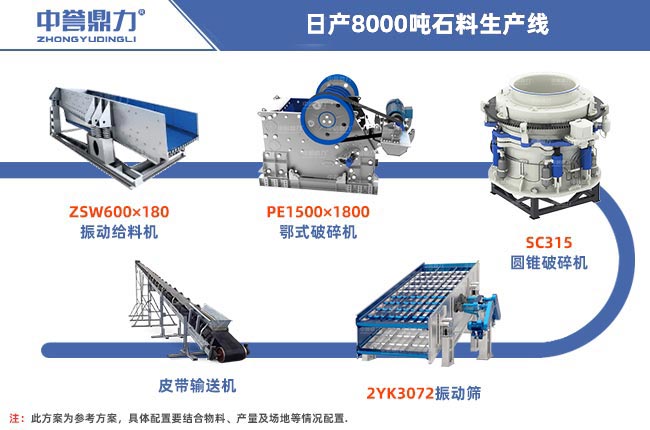 日產8000噸石料生產線需要用到的設備有:給料設備、破碎設備、篩分設備和輸送設備,時產量大概是1000噸左右,常見配置方案有以下幾種,處理軟巖的配置方案、處理硬巖的配置方案,重錘破配置方案以及移動式生產配置方案。