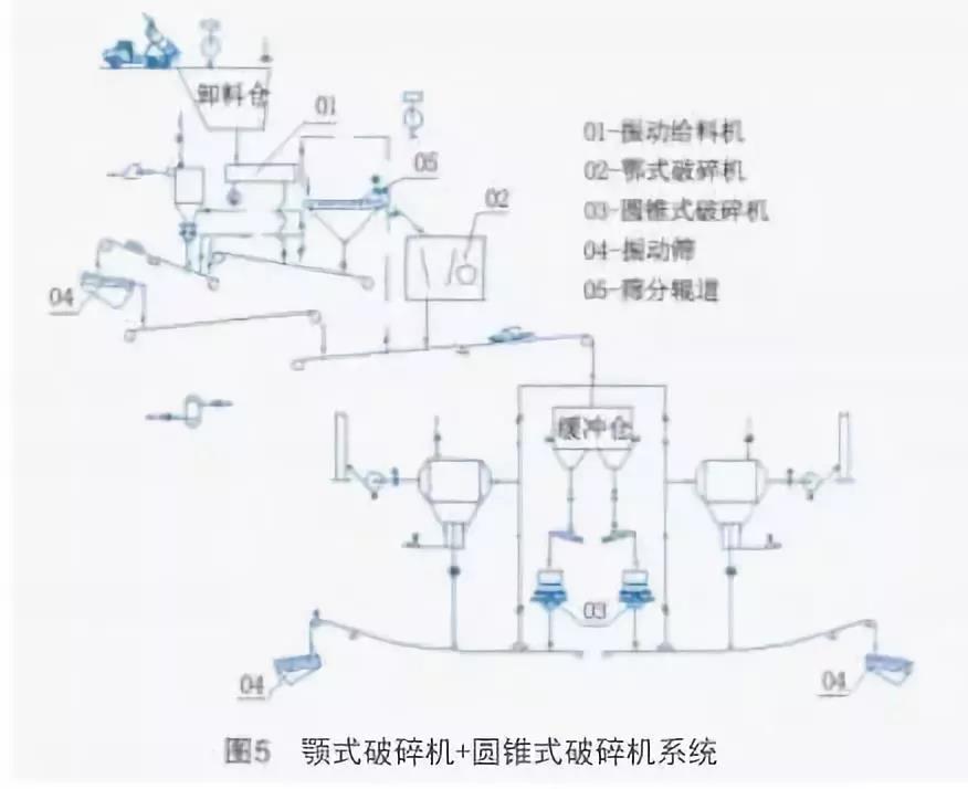 此系統由顎式破碎機、圓錐式破碎機和篩分系統組成見圖5。
