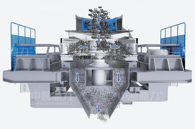 立式打砂機是中心進料,進料口在設備頂部,物料從進料口進入通過葉輪旋轉將物料拋出,實現石打石或石打鐵的破碎方式。