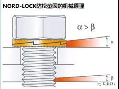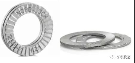 該防松墊圈由兩片墊片組成,外側(cè)是帶有放射狀凸紋面,內(nèi)側(cè)為斜齒面。當(dāng)裝配時,內(nèi)側(cè)斜齒面間相對,外側(cè)放射狀凸紋面與兩端接觸面成咬合狀態(tài)。當(dāng)連接件受到振動,并使螺栓發(fā)送松動趨勢時,僅僅允許兩片墊圈內(nèi)側(cè)斜齒面間相對錯動,產(chǎn)生抬升張力,從而達(dá)到100%的鎖緊效果。