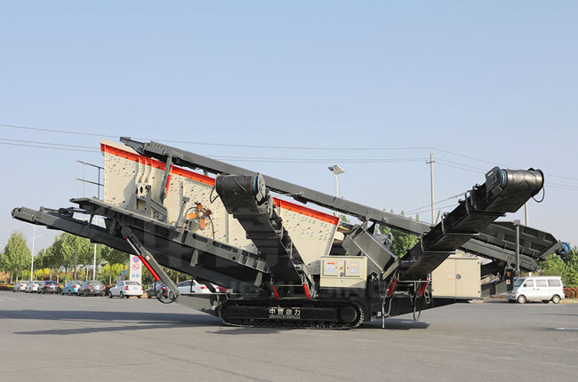 履帶篩分機構造部分包括緩沖料倉、振動篩、皮帶機、檢修走廊、液壓裝置、分料斗、除鐵器、行走履帶等組成。