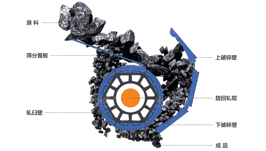 臥式旋回破碎機內部是由篩分篦板、上破碎壁、旋回軋輥、下破碎壁、軋臼壁組成。