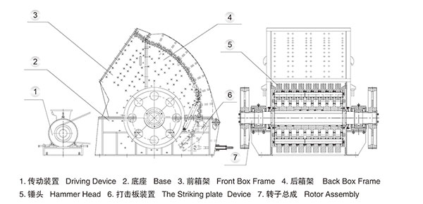 錘式礦山碎石機在工作時,電機驅動轉子在機腔內高速操作,石頭自頂部送料口給入機內,受高速運動的錘子的撞擊、沖擊、剪切、碾磨影響而粉碎,在轉子底部,裝有蓖條、粉碎石頭中小于篩網目數的粒級 通過蓖條排出,過篩網目數的粗粒級 阻留在蓖條上繼續獲得錘子的撞擊和碾磨, 再通過蓖條排出機外。