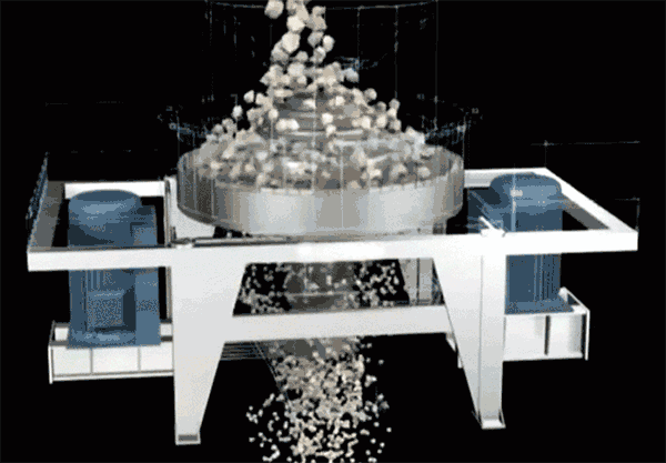 石頭由給料斗進(jìn)入制砂整形機(jī),經(jīng)分料器將石頭分成兩部分,一部分由分料器中間進(jìn)入高速操作的葉輪中,在葉輪內(nèi)被快速加速,然后一起沖擊到渦支腔內(nèi)石頭襯層上,被石頭襯層反彈,斜向上沖擊到渦動(dòng)腔的頂部,又改換其運(yùn)動(dòng)方向,偏轉(zhuǎn)向下運(yùn)動(dòng),從葉輪流道發(fā)射出來(lái)的石頭形成持續(xù)的石頭幕,這樣一塊石頭在渦動(dòng)粉碎腔內(nèi)獲得兩次以至多次機(jī)率抨擊、磨擦和粉碎破碎影響。